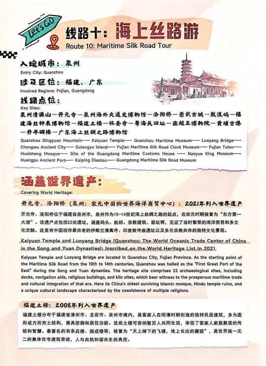 9月25日上午,2025中国世界遗产旅游推广联盟大会在吉林省集安市举办。期间发布十条中国世界遗产游主题线路,其中“海上丝路游”线路入选。该线路由泉州入境,包括泉州清源山、开元寺、泉州海外交通史博物馆、洛阳桥、崇武古城等。此次线路发布旨在让海内外游客深度领略中国世界遗产魅力,更好地满足游客品质化消费需求。