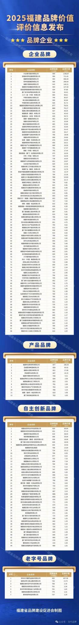 2025年10月16日上午,2025福建品牌价值评价信息发布暨推动福建品牌高质量发展活动在邵武市黄峭广场会展中心圆满举行,现场权威发布193个评价信息,涵盖企业品牌98个、产品品牌12个、自主创新品牌44个、老字号品牌7个和区域品牌32个。活动同步揭晓了第二届福建品牌价值评价百强榜单,并发布《2025年福建品牌价值评价发展报告》。