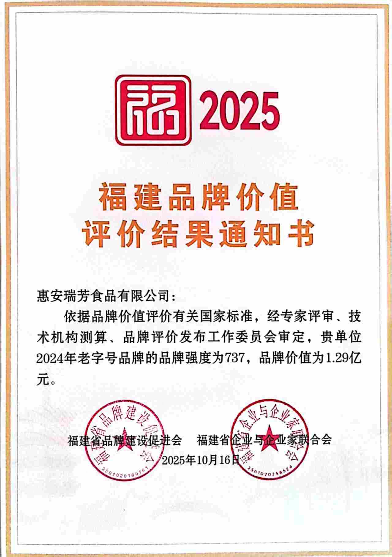 惠安瑞芳食品有限公司 品牌价值 1.29亿元
